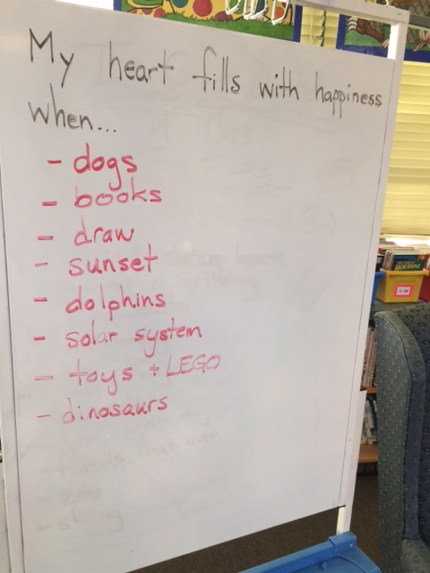 In the Library, Mrs. Kennedy read aloud the beautiful, My Heart Fills with the Happiness, by Monique Gray Smith and illustrated by Julie Flett, and then the children shared some of their ideas of happiness…