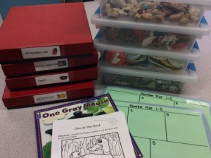 For our number centres, we’re using some familiar materials, including pattern blocks and multilinks. We’ve also introduced some new resources such as the red game boxes from the Workjobs of Math Their Way. Inside each Workjob box are gameboards and counters. In Kindergarten we use them for patterning and counting. When we taught Grades 1-3, those same Workjobs were used for addition and subtraction to 10 and multiplication and division. It’s exciting to watch our children explore, create and count sets using many kinds of educational resources also allows them to practise making choices, be flexible in their thinking and show number in many different ways.