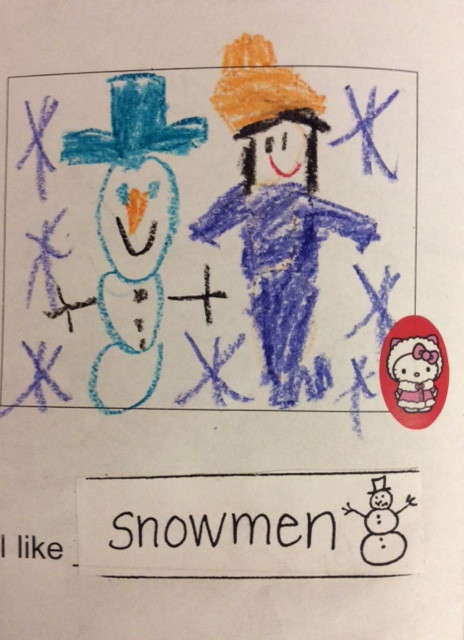We introduced the sentence frame “I like…” as part of our Winter theme. The children selected their favourite things about Winter from a Winter word bank, cut and pasted their word to the page, and illustrated each one for their “I Like Winter” booklet.