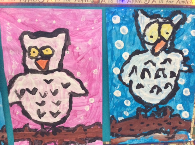 Followed by “snow” and outlining and painting in the owl…