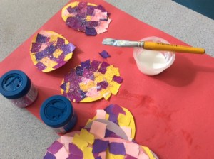 We also made torn paper eggs decorated with sparkle mod podge and layered with pink and purple sparkles. The children really love to make crafts and this makes a huge difference in developing their fine motor strength and control (very important for printing, drawing, colouring, cutting and pasting).