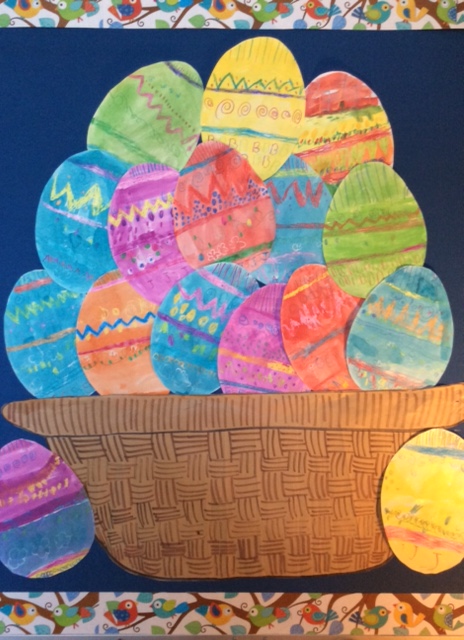 Next, we made wax crayon resist Easter eggs, with a focus on line, shape, patterns and following teacher directions. We gave our eggs a paint wash with tempera paint pucks and then filled our Easter basket!