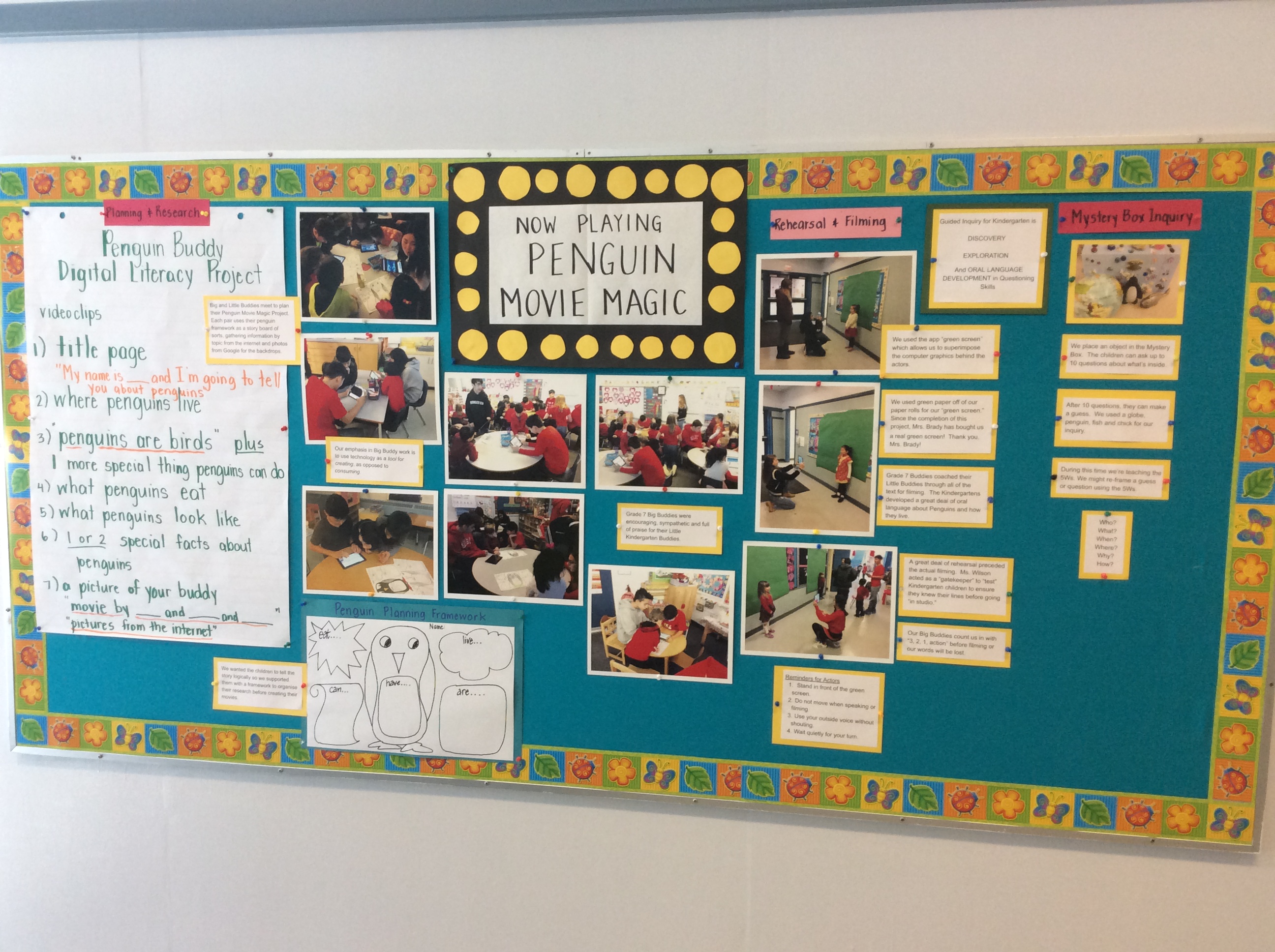 You can see the Kindergarten Visualising Learning bulletin board outside of my classroom. Here, we have a few photos of the Big and Little Buddies doing their research for their Penguin Movie Magic project. This Project is an integration of digital learning with the guided inquiry process we use in Kindergarten. At Student-Led Conferences you saw the final version of weeks of hard work. We will be posting in more detail about our experience later next month.