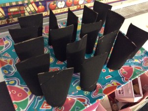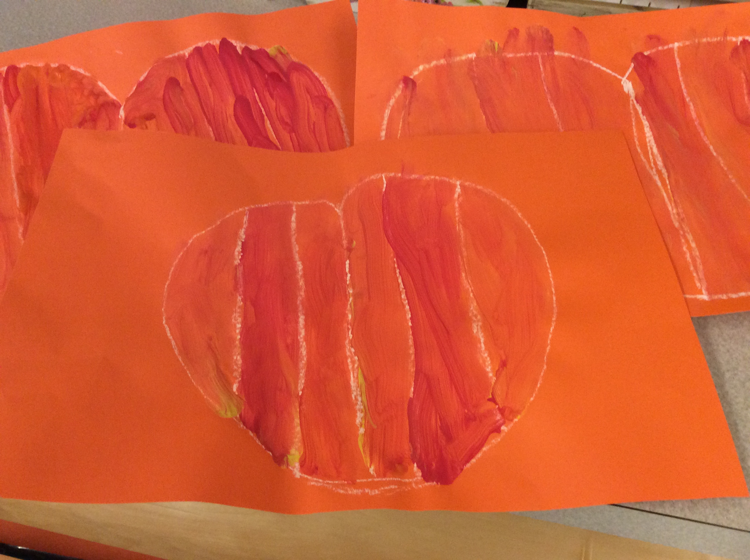 Talk about filling your space…look at the size of these painted pumpkins! We read Too Many Pumpkin by Linda White and Megan Lloyd, then proceeded to draw pumpkin outlines with ribs using white pastel. This is a favourite project of ours, from deepspaceparkle It was very interesting to watch the children work on a large scale – the biggest piece of paper (12” x 18”) we’ve asked them to fill this year. It can be hard to go big. Not all children realize they really have to move their hands and arms to stretch to fill the corners of a big sheet of paper. They need their helping hand (their non-writing hand) to hold the paper down or the whole thing will slide. It’s a lot of think about.
