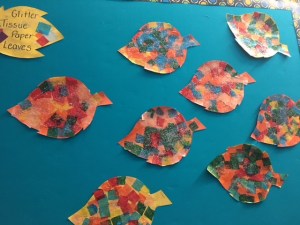 Using a similar technique to our tissue paper apples, we continue to improve our finger motor skills by cutting and gluing tissue squares and making these beautiful leaves.