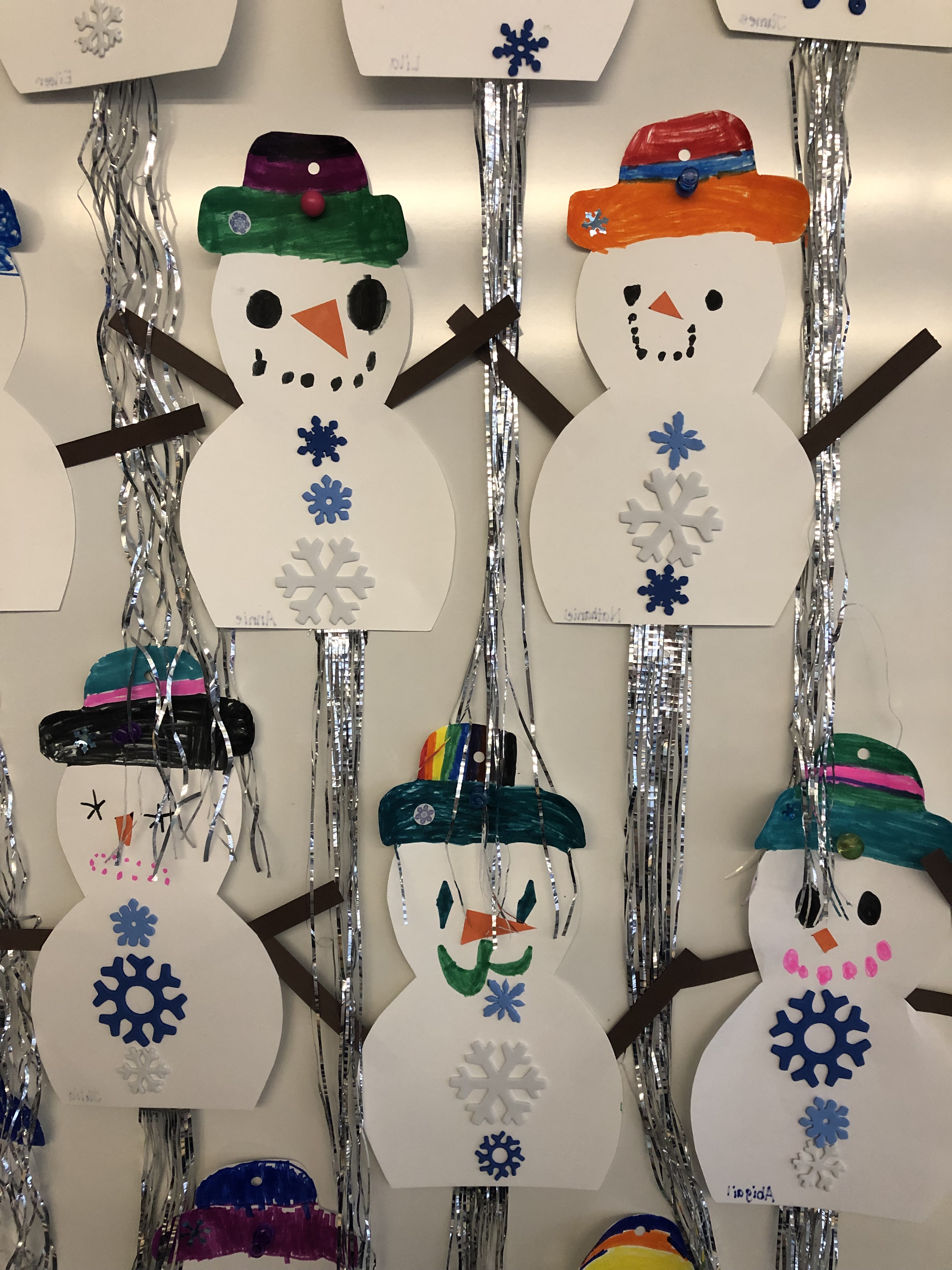 Our classrooms are not complete without something hanging from the ceiling: Mitten snowman hangers!