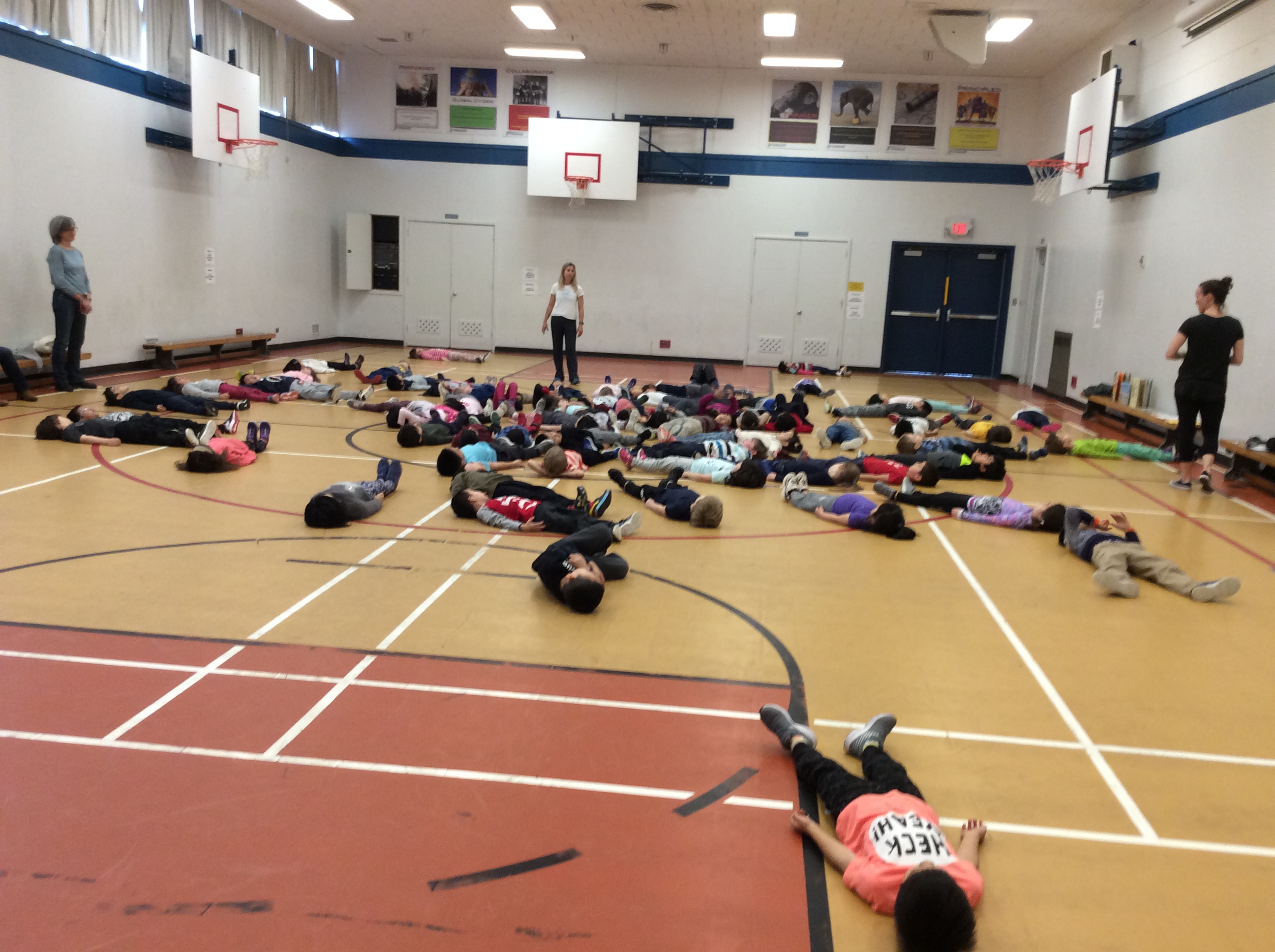 It was our Sweat Workshop on Wednesday with our WV Physical Literacy Teachers and sweat we did! Wow! What amazing energy from the Kindergarten and Grade 1 children – that’s about 80 children in the gym together working through a locomotor movement warm-up and then a series of stations including squats, planks, incline push-ups and knee to elbow movements. Although we tried to take photos of our athletes, they were moving too fast. We were able to get a final picture, though, of everyone at rest.