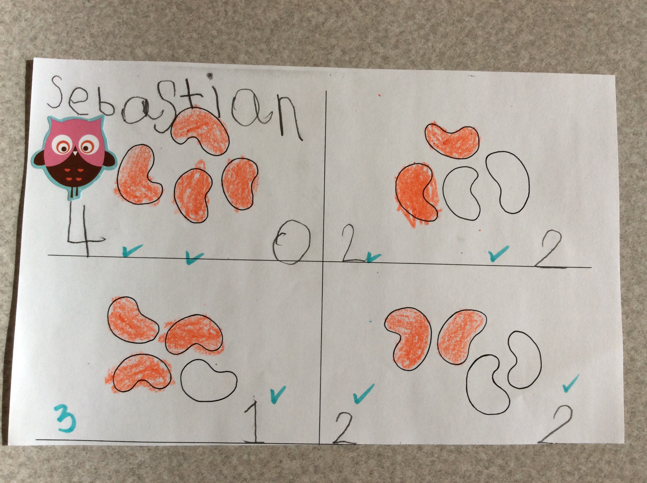 In between all of this winter excitement we somehow finished our printing of the letter Q while continuing to work on developing number sense in Math. We introduced a new activity, “bean spills,” with double sided counters to explore the possible number combinations we could make to 4. We’ll be using this strategy again with other numbers.