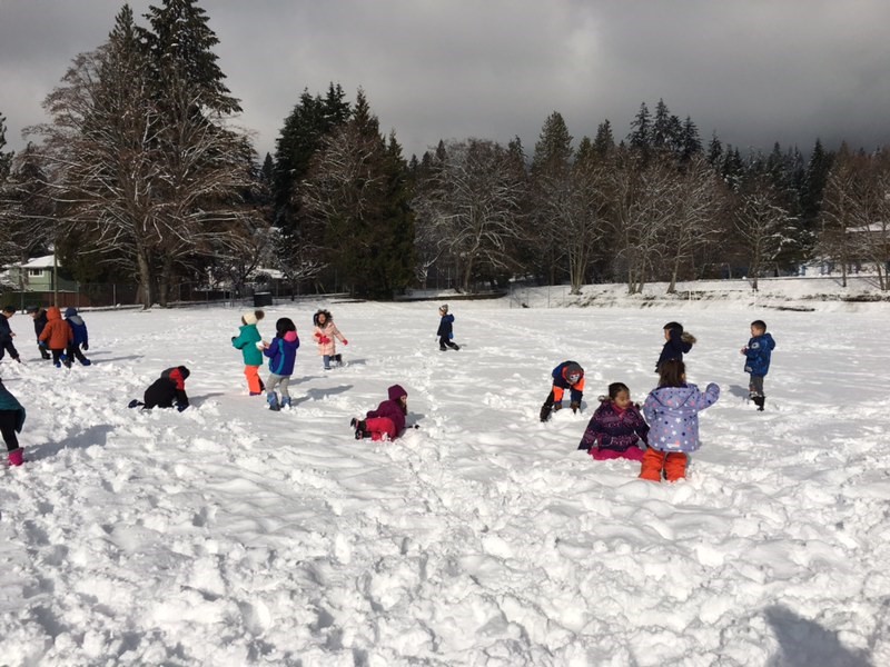 Monday, February 11 started off innocently enough, but then the snow came that night, which was immediately followed by a Snow Day! We know this was a very exciting day for our little ones as we do not often get a lot of snow in the Vancouver area. And we were happy to extend their playtimes back at school the next day so the children could run in the deeper snow on the field, roll snowballs, make snow angels and climb on top of the huge snowballs made by the Intermediate students. For some of the children, we know this fun time with friends in the snow might be remembered as one of the best days of the year!