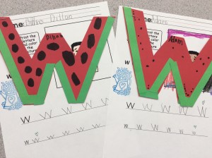 W is a watermelon…the children loved making the adorable watermelons. Everybody had a story to tell about the seeds (spitting, spitting, and more spitting) and we all agreed it was the best and juiciest part of summer living. Our Ws looked pretty amazing as well!