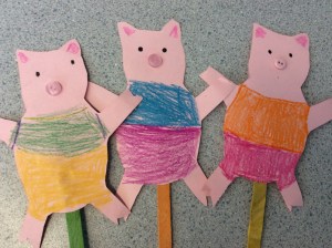 We’re starting Fairy Tales during Literacy Time. It’s one of our absolutely favourite integrated learning experiences for the children. Under our watchful eye, our UBC Teacher Candidates will be teaching many different Fairy Tales, the structure of stories (beginning, middle, end) and the elements of a story (plot, character, setting, theme) with the Kindergarten. The children will hear different versions of the same story to compare and contrast, complete a variety of written response activities, experience lots of oral storytelling and make some fun crafts so they can retell the stories themselves at school, and then at home. The first story this week was “The Three Little Pigs.” The literary focus was on beginning, middle and end; the children made Wolf puppets during Art and Piggie stick puppets with our Big Buddies.