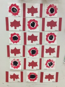 In the Kindergarten classroom, we focus on “what is peace?” and how the events of the past have shaped our present and future where we can have the freedom to choose to live our lives as we wish. We talk about the significance of the poppy and represent that in our creative efforts. Our children made Canada flags, printed poppies (with an acorn squash and potato, no less) and sharing, drawing and writing our thoughts about what peace means to us. We contributed much of our art to decorate the gym.