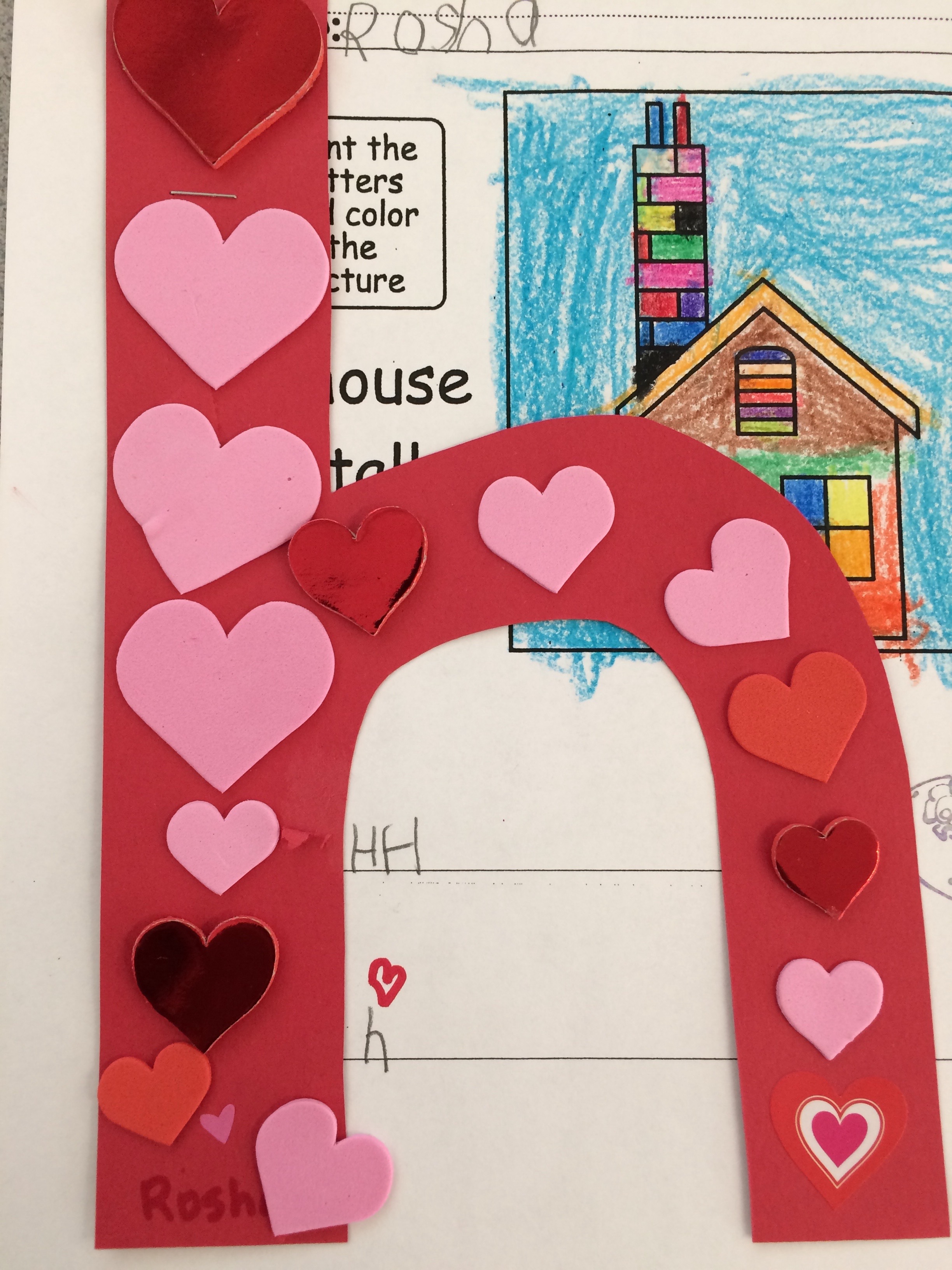 H is a heart…we like to use stickers a lot in some activities. The dexterity the children need to remove the backings of the stickers is impressive. Have you tried it yourself lately? It is very fussy work, but determination perseveres in the Kindergarten;