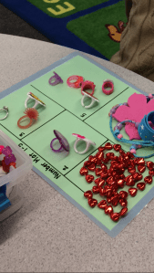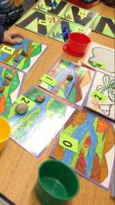 Math Centre Rotations: The primary focus during the second term for Kindergarten mathematics is on number sense. Although many of the children are very skilled in rote number counting, we are developing their sense of number through subitizing (recognizing “how many” in a set eg., dot patterns on a dice); part-whole relationships (the number of objects remains the same even if arranged differently); creating and counting (one-to-one correspondence) sets of objects; partitioning (breaking down numbers into units which are easier to manage such as 5s and 10s; and cardinality (the actual count or number of items in a set)