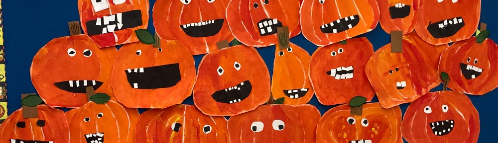 Well, no sooner did the turkeys fly away then we started pulling out the Hallowe’en activities. The first thing we need to do to get ready for the Big Day is to start decorating our classrooms with the children’s artwork. Our big project this week was a beautiful painted pumpkin from the art website, Deep Space Sparkle.