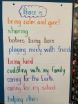 Based upon their previous experience, and the shared knowledge we work to create among the class, our Kindergarten children take what they are able to from the stories, art activities and gentle discussions we have in class.  Many of our children have an innate sense of what “peace” or “peacefulness” means to them.  Other children may have family history of war veterans, visits to the Cenotaph to draw upon.  But what we have in common is a mutual understanding is that home, and where our families are, is peace to us. Here are some of the thoughts our Kindergarten students about what peace means to them….